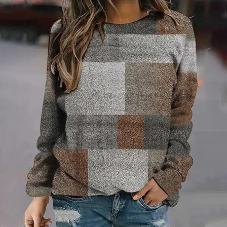 Dam T-shirt Rundhalsad Långärmad Splicing Rutig Casual Topp,
